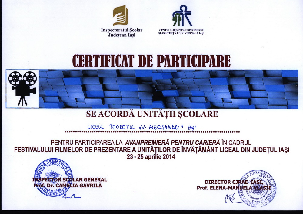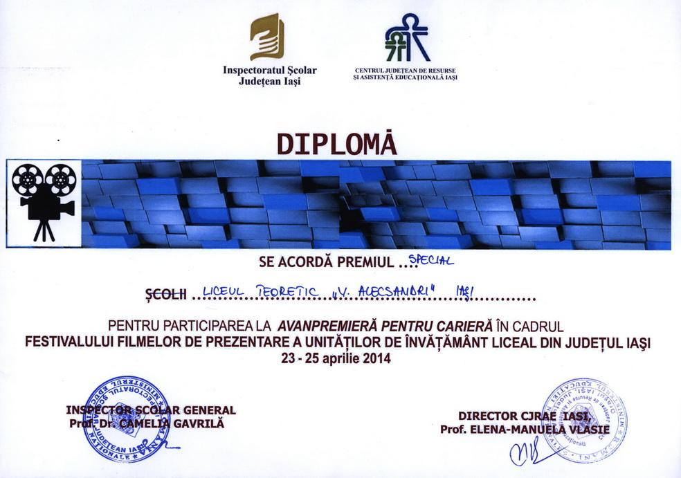 Liceul Teoretic "Vasile Alecsandri" Iași a participat și a obținut premiul special pentru participarea la AVANPREMIERĂ PENTRU CARIERĂ în cadrul FESTIVALULUI FILMELOR DE PREZENTARE A UNITĂȚILOR DE ÎNVĂȚĂMÂNT LICEAL DIN JUDEȚUL IAȘI, în perioada 23-25 aprilie 2014.