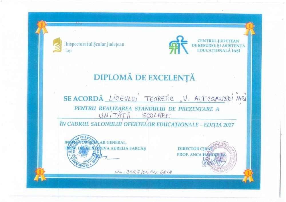 Felicitări! Liceul Teoretic „Vasile Alecsandri” a obținut diplomă de excelență pentru realizarea standului de prezentare în cadrul Salonului Ofertelor Educaționale