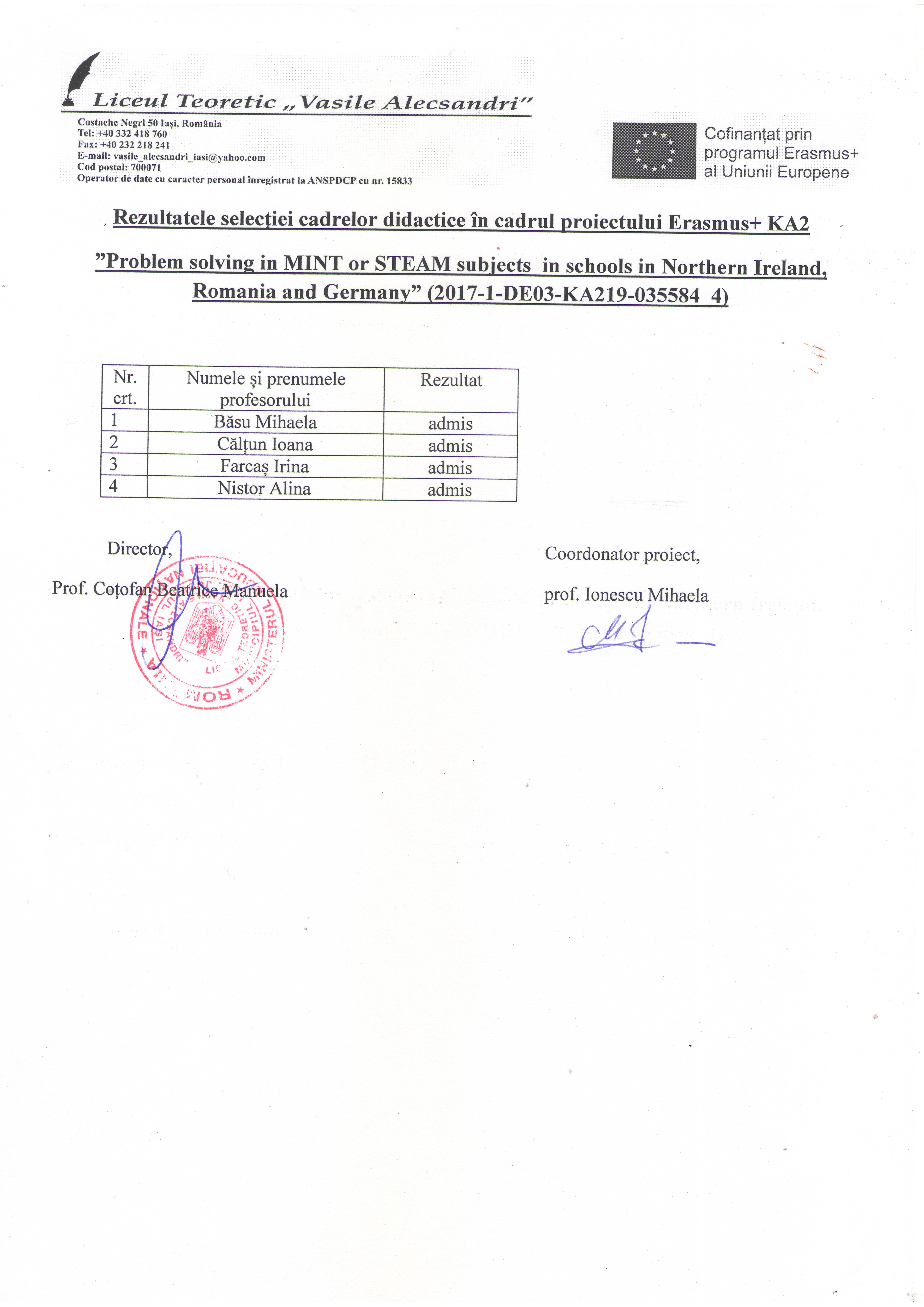 Rezultate interviu de selecție a echipei de profesori din cadrul proiectului