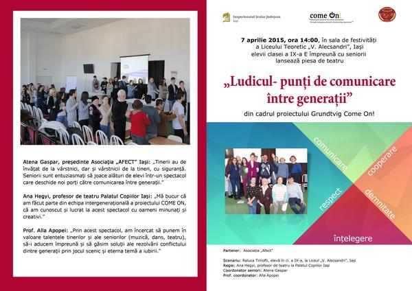 În data de 7 aprilie 2015, ora 14,00, în sala de festivități a Liceului Teoretic "Vasile Alecsandri", Iași elevii clasei a IX-a E împreună cu seniorii au lansat piesa de teatru "Ludicul - punți de comunicare între generații".